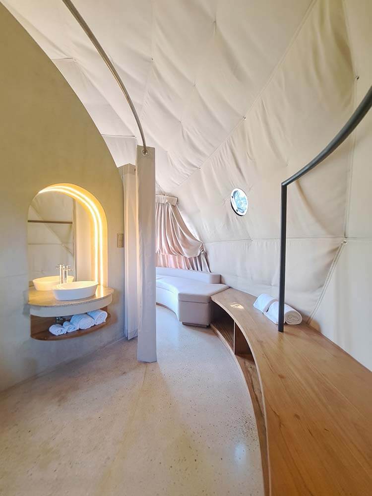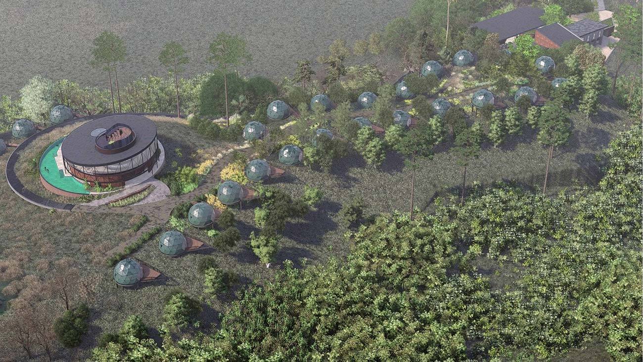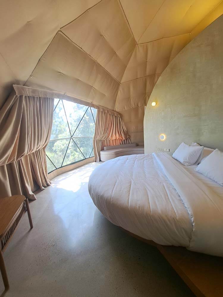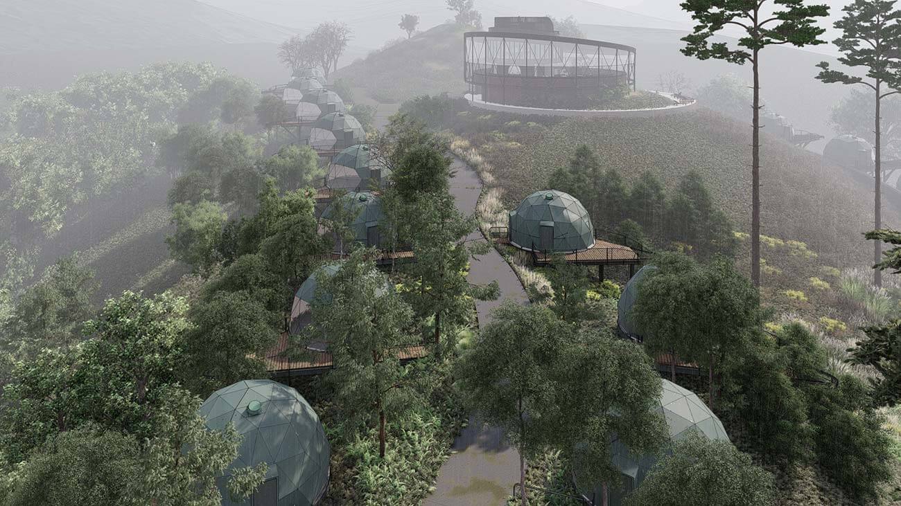 The design draws inspiration from a luxury glamping ethos, with prefabricated dome villas scattered across the hillside in harmony with the terrain. Each dome is strategically positioned and thoughtfully separated by lush greenery and natural vegetation, ensuring utmost privacy and an intimate connection with the surrounding landscape. The geometric forms of the domes, with their smooth curves and clean lines, complement the rolling contours of the land, creating a seamless balance between contemporary living and the raw, untouched beauty of the outdoors. This deliberate arrangement allows guests to enjoy a private sanctuary while still being enveloped by the sights, sounds, and scents of Haputale’s unique ecosystem.
