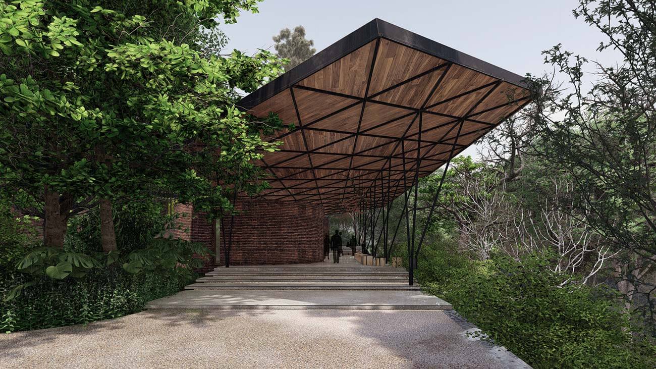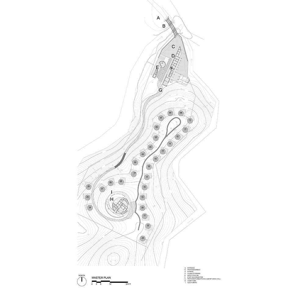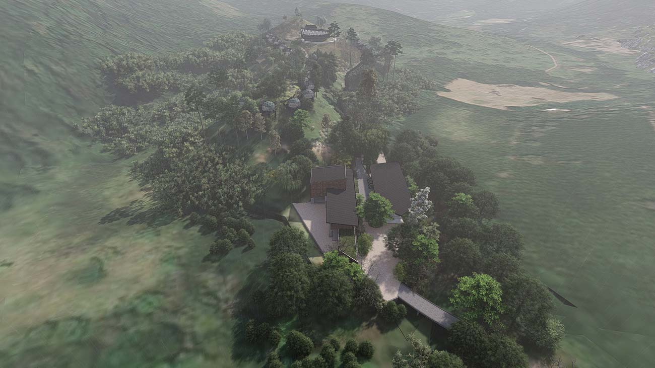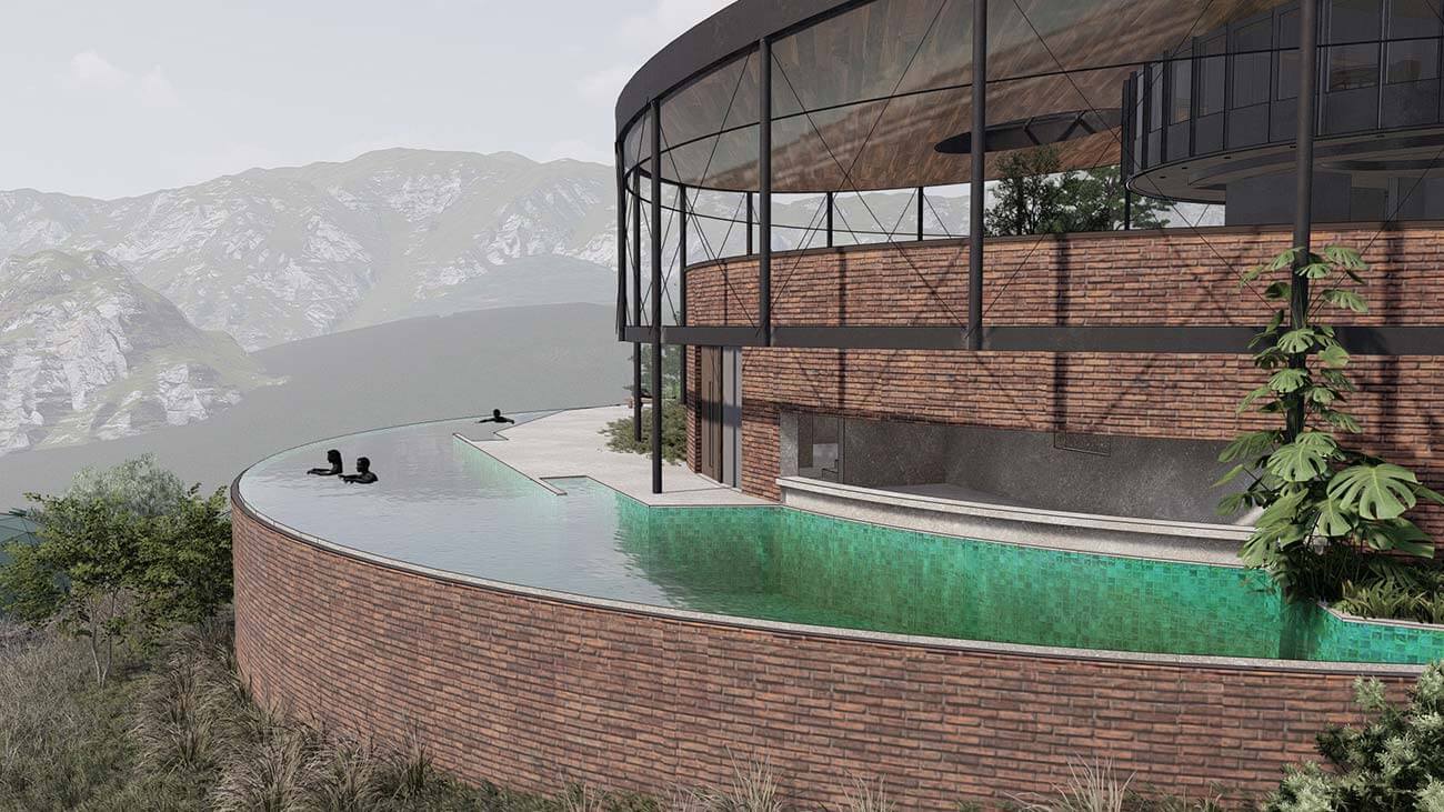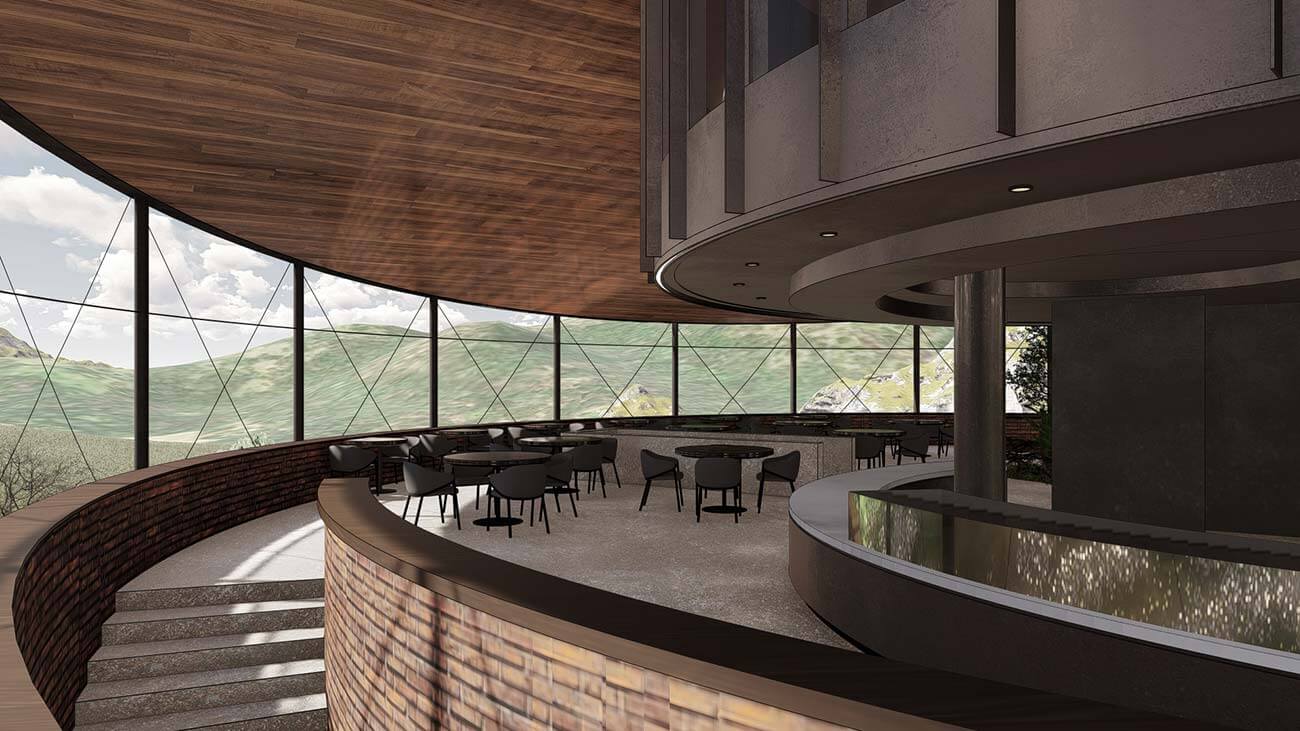 The retreat is anchored by two architectural focal points, each perched atop a natural peak. The entry pavilion, a streamlined linear structure, serves as the gateway to the resort—welcoming guests into the calm of the hills. From here, scenic buggy paths wind through the property, carrying guests to their private villas along routes that reveal ever-changing vistas. At the opposite peak, the signature restaurant offers an unforgettable dining experience in a circular structure providing an uninterrupted 360-degree panoramic view of the rolling hills, distant valleys, and the endless sky.